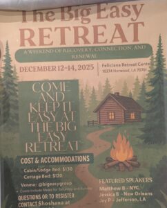 A weekend of recovery, connection, and renewal. Cost & Accommodations: Cabin/Lodge Bed ($130), Cottage Bed ($120), Venmo: @bigeasygroup; costs include meals for Saturday and Sunday. Featured Speakers: Matthew B. (NYC), Jessica B. (New Orleans), Jay P. (Jefferson).