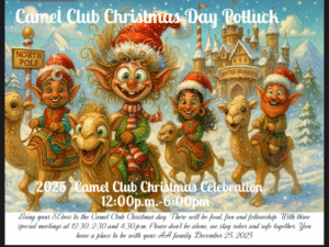 Bring your sElves to the Camel Club Christmas Day for food, fun, and fellowship. Three special meetings at 12:30pm, 2:30pm, and 4:30pm.