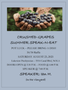 Sat., August 23, 2025, 5:30pm doors, 6pm food, 7pm speaker
