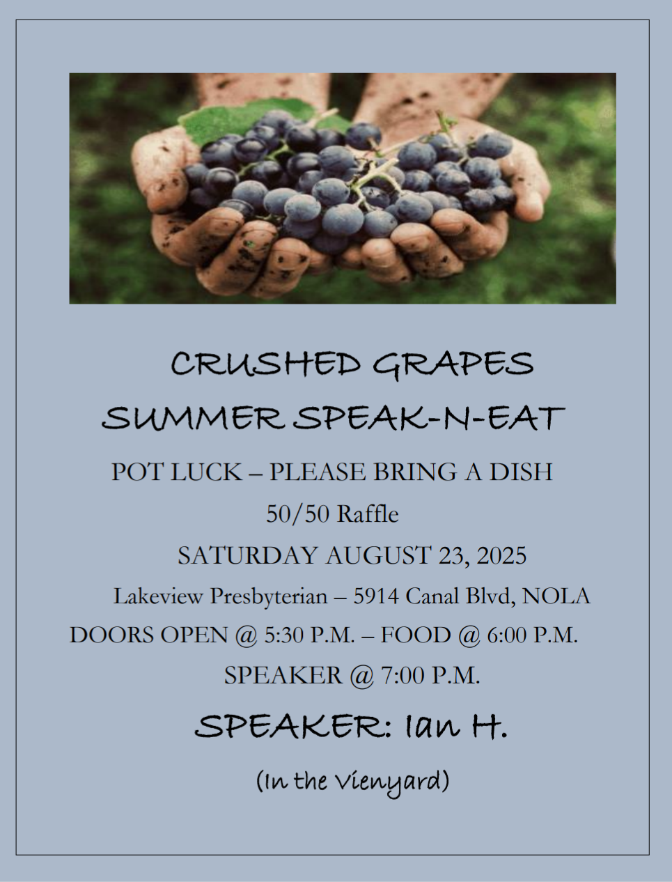 Join us for speaker Ian H. (In the Vineyard) and a potluck dinner, please bring a dish. 50/50 raffle.