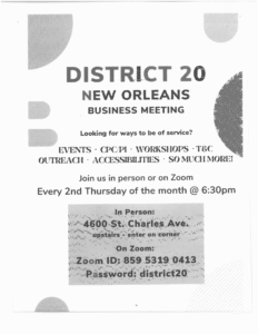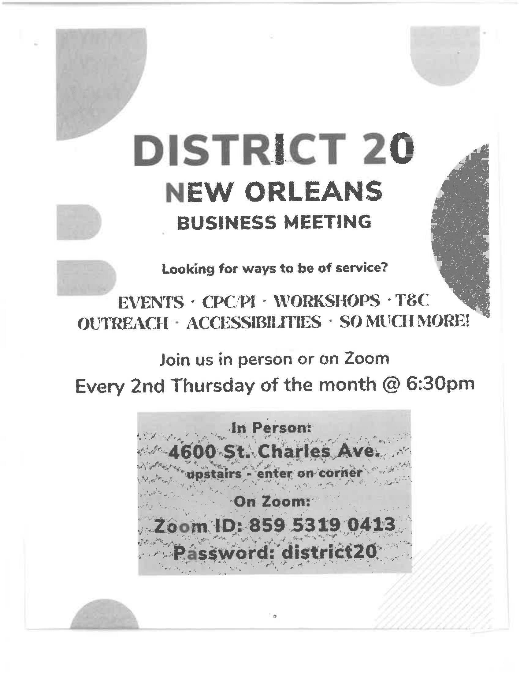 DISTRICT 20 MEETS 6:30pm 2ND THURSDAY MONTHLY IN PERSON AND ONLINE