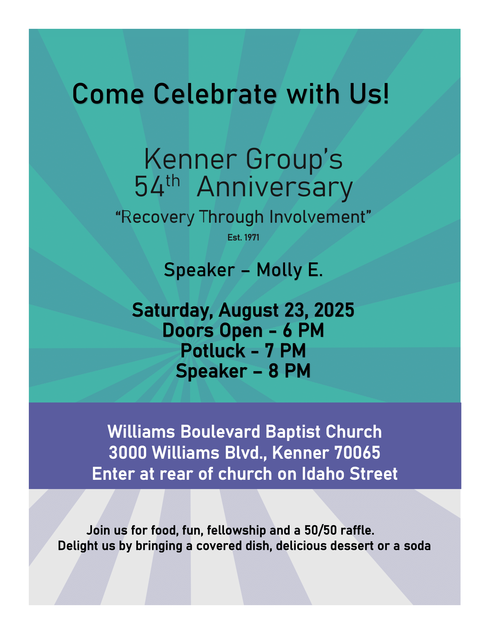 Enter at rear of church on Idaho St. Join us for speaker Molly E., along with food, fun, fellowship, and a 50/50 raffle. Please bring a dish, dessert, or soda.