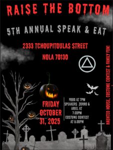 Fri., October 31, 2025, 7pm food, 7:30pm speakers, 8:30pm costume contest