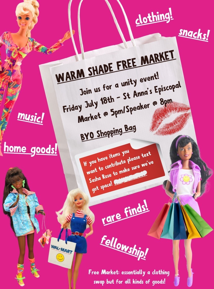 Free market: Like a clothing swap for all kinds of goods, including clothing, home good, and other rare finds. BYO Shopping Bag.
